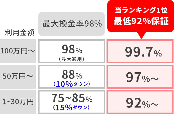 私たちが普段使うような数万円の利用だと、そこから手数料などが引かれてしまい、実際の換金率は70%〜80%台になってしまうことがよくあります。「思ったより少なかった」と後悔しないよう、事前の確認が大切です。